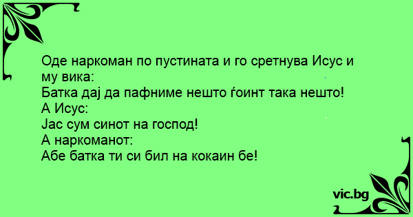 Оде наркоман по пустината и го сретнува Исус и му вика: