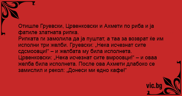 Рипката ги замолила да ја пуштат, а таа за возврат ќе им исполни три желби. Груевски: „Нека исчезнат сите сдсмоовци!“ – и желбата му била исполнета. Црвенковски: „Нека исчезнат сите вмроовци!“ – и оваа желба била исполнета. После ова Ахмети длабоко се замислил и рекол: „Донеси ми едно кафе!“