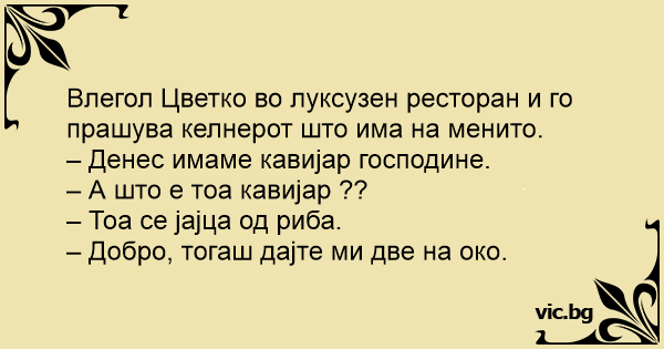 Влегол Цветко во луксузен ресторан и го прашува келнерот што има на менито.