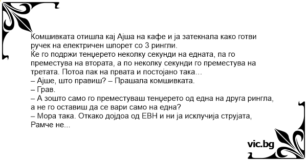 – А зошто само го преместуваш тенџерето од една на друга рингла, а не го оставиш да се вари само на една?