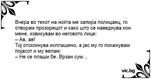 Вчера во текот на ноќта ме запира полицаец, го отворам прозорецот и како што се наведнува кон мене, извикувам во неговото лице:
