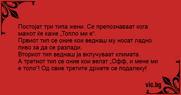 Постојат три типа жени. Се препознаваат кога мажот ќе каже „Топло ми е“.