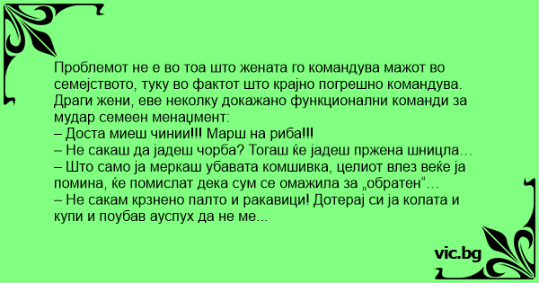 Проблемот не е во тоа што жената го командува мажот во семејството, туку во фактот што крајно погрешно командува. Драги жени, еве неколку докажано функционални команди за мудар семеен менаџмент: