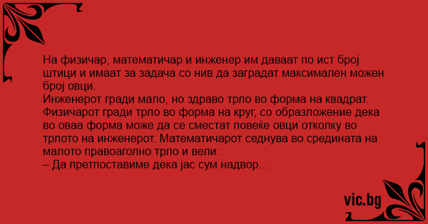 На физичар, математичар и инженер им даваат по ист број штици и имаат за задача со нив да заградат максимален можен број овци.