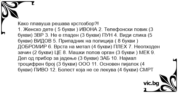 1. Женско дете ( 5 букви ) ИВОНА 2. Телефонски повик (3 букви) ЗВР 3. Не е гладен (3 букви) ПУН 4. Види слика (5 букви) ВИДОВ 5. Припадник на полиција ( 8 букви ) ДОБРОМИР 6. Врста на метал (4 букви) ПЛЕХ 7. Неопходен зачин (2 букви) ЦЕ 8. Машки полов орган (3 букви ) МЕК 9. Дел од прибор за јадење (3 букви) ЗАБ 10. Најмал троцифрен број (3 букви) ООО 11. Основен пијалок (4 букви) ПИВО 12. Болест која не се лекува (4 букви) СМРТ