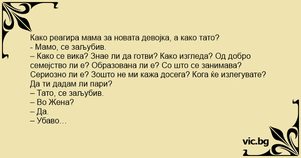 – Како се вика? Знае ли да готви? Како изгледа? Од добро семејство ли е? Образована ли е? Со што се занимава? Сериозно ли е? Зошто не ми кажа досега? Кога ќе излегувате? Да ти дадам ли пари?