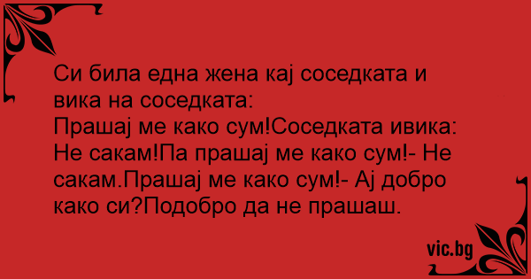 Прашај ме како сум!Соседката ивика: Не сакам!Па прашај ме како сум!- Не сакам.Прашај ме како сум!- Ај добро како си?Подобро да не прашаш.