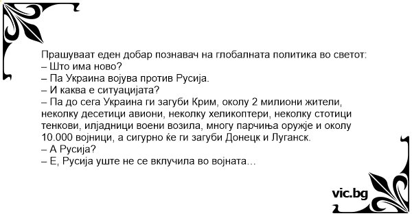 Прашуваат еден добар познавач на глобалната политика во светот: – Што има ново? – Па Украина војува против Русија. – И каква е ситуацијата? – Па до сега Украина ги загуби Крим, околу 2 милиони жители, неколку десетици авиони, неколку хеликоптери, неколку стотици тенкови, илјадници воени возила, многу парчиња оружје и околу 10.000 војници, а сигурно ќе ги загуби Донецк и Луганск. – А Русија? – Е, Русија уште не се вклучила во војната…