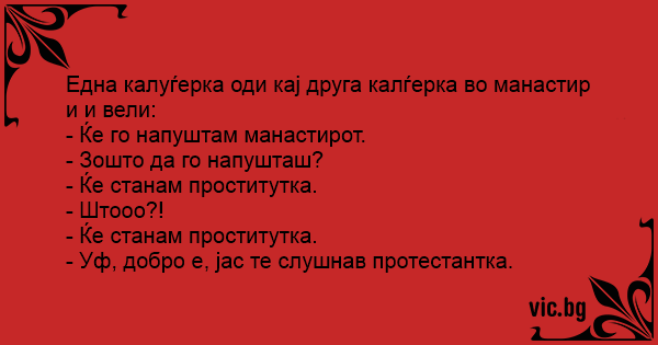 Maica stareţă de la o şcoală catolică stă de vorbă cu elevele ei şi le întreabă ce doresc sa devina când vor creşte mari. O fetiţă de numai doisprezece ani spune: - Eu vreau să devin prostituată...