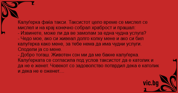 Калуѓерката се согласила под услов таксистот да е католик и да не е женет. Човекот со задоволство потврдил дека е католик и дека не е оженет. Калуѓерката го бакнала страсно.