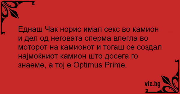 Еднаш Чак норис имал cekc во камион и дел од неговата cпepma влегла во моторот на камионот и тогаш се создал најмоќниот камион што досега го знаеме, а тој е Optimus Prime.