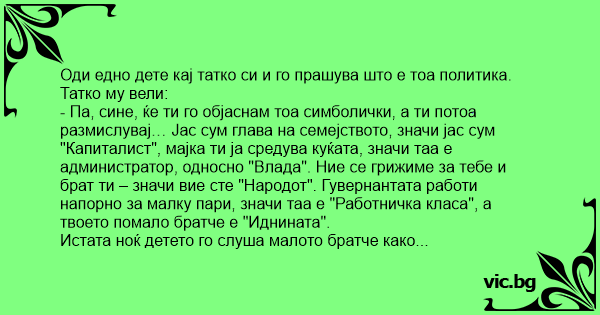 Едно дете го прашува својот татко: - Тато што е тоа политика? - Епа тоа ти е вака сине: Јас во фамилијава заработувам, значи јас сум капитализам, јас им плаќам на чистачката и дадилката значи тие...