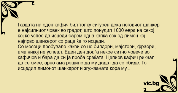 Газдата на еден кафич бил толку сигурен дека неговиот шанкер е најсилниот човек во градот, што понудил 1000 евра на секој кој ќе успее да исцеди барем една капка cok од лимон кој најпрво шанкерот со раце ќе го исцеди.