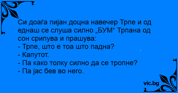 Си доаѓа пијан доцна навечер Трпе и од еднаш се слуша силно „БУМ“ Трпана од сон срипува и прашува: