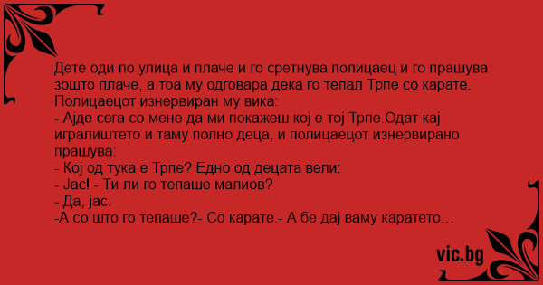 Дете оди по улица и плаче и го сретнува полицаец и го прашува зошто плаче, а тоа му одговара дека го тепал Трпе со карате. Полицаецот изнервиран му вика:
