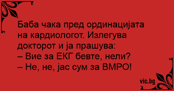 Баба чака пред кабинета на кардиолога. Излиза лекарят и пита: