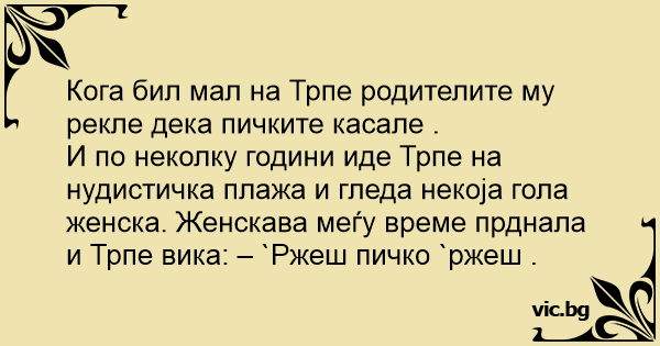 И по неколку години иде Трпе на нудистичка плажа и гледа некоја гола женска. Женскава меѓу време прднала и Трпе вика: – `Ржеш пичко `ржеш .