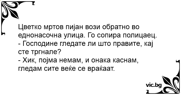 Цветко мртов пијан вози обратно во еднонасочна улица. Го сопира полицаец.