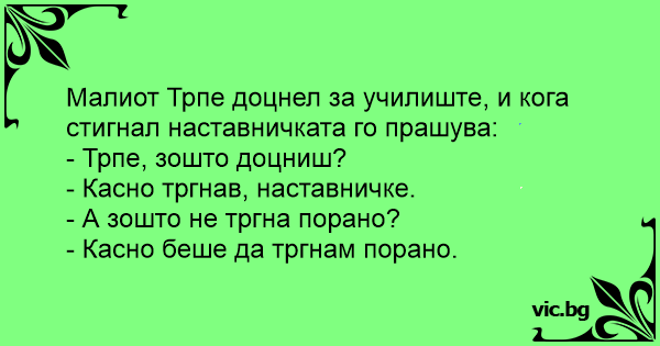 Малиот Трпе доцнел за училиште, и кога стигнал наставничката го прашува: