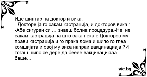 -Абе сигурен си … знаеш болна процедура.-Не, не сакам кастрација па што сака нека е.Докторов му прави кастрација и го прака дома и шипо го глеа комшијата и овој му вика напраи вакцинациаја ?И тогаш шипо се дере да бееее вакцинацијааа беше…