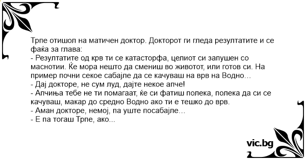 Трпе отишол на матичен доктор. Докторот ги гледа резултатите и се фаќа за глава: