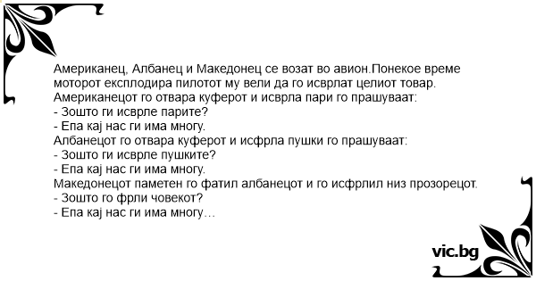 Американец, Албанец и Македонец се возат во авион.Понекое време моторот експлодира пилотот му вели да го исврлат целиот товар.