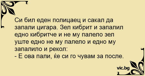Си бил еден полицаец и сакал да запали цигара. Зел кибрит и запалил едно кибритче и не му палело зел уште едно не му палело и едно му запалило и рекол: