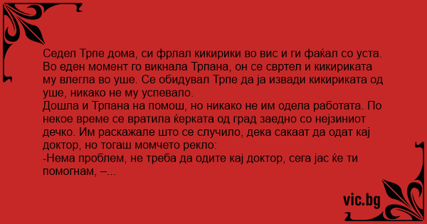 Седел Трпе дома, си фрлал кикирики во вис и ги фаќал со уста. Во еден момент го викнала Трпана, он се свртел и кикириката му влегла во уше. Се обидувал Трпе да ја извади кикириката од уше, никако не му успевало.