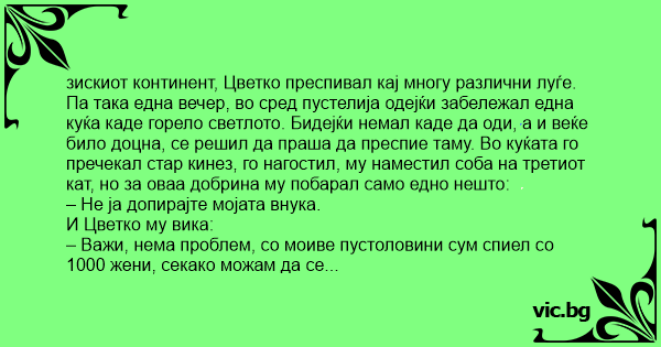 зискиот континент, Цветко преспивал кај многу различни луѓе. Па така една вечер, во сред пустелија одејќи забележал една куќа каде горело светлото. Бидејќи немал каде да оди, а и веќе било доцна, се решил да праша да преспие таму. Во куќата го пречекал стар кинез, го нагостил, му наместил соба на третиот кат, но за оваа добрина му побарал само едно нешто: – Не ја допирајте мојата внука. И Цветко му вика: – Важи, нема проблем, со моиве пустоловини сум спиел со 1000 жени, секако можам да се воздржам… Во тој момент ја видел. Тоа била најубавата девојка на светот. И му се насмевнувала. И така Цветко си легнал, и доцна во ноќта таа дошла и легнала до него. Си рекол Цветко, од кај ќе знае старецот, ај ќе си направам ќеф… Наредното утро се буди Цветко и гледа, на стомакот ставена цигла… на циглата пишува: – Прв чекор на кинеско мачење: Оваа цигла, содржи доволно експлозив за да те разнесе цел!!! И се мисли Цветко и смислува… ја фрла циглата од прозор.. Во тој момент забележува на ѕидот од соседната куќа пишува: – Втор чекор на кинеско мачење: Циглата е врзана за вашето лево јајце! И сега си вика Цветко: – Ќе скокам и јас, не можам без јајце да останам, цел живот ќе сум инвалид… И така скока, кога паѓајќи забележува дека на ѕидот од куќата од стариот кинез, со големи црвени букви испишано: – Трет чекор на кинеско мачење: Вашето десно јајце е врзано за креветот!