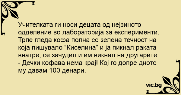 Учителката ги носи децата од нејзиното одделение во лабораторија за експерименти. Трпе гледа кофа полна со зелена течност на која пишувало “Киселина” и ја пикнал раката внатре, се зачудил и им викнал на другарите: