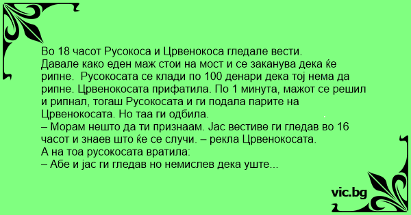 Давале како еден маж стои на мост и се заканува дека ќе рипне. Русокосата се клади по 100 денари дека тој нема да рипне. Црвенокосата прифатила. По 1 минута, мажот се решил и рипнал, тогаш Русокосата и ги подала парите на Црвенокосата. Но таа ги одбила.