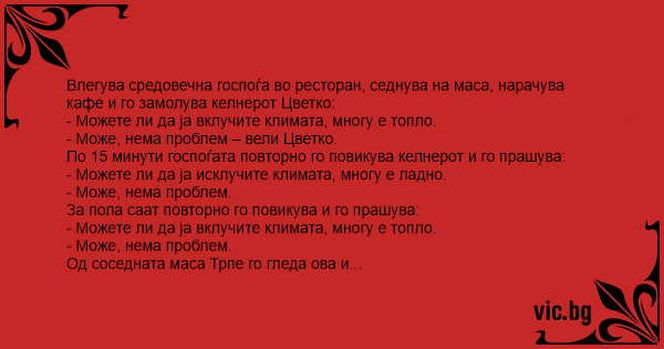 Влегува средовечна госпоѓа во ресторан, седнува на маса, нарачува кафе и го замолува келнерот Цветко: