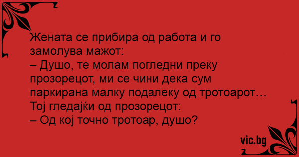 – Душо, те молам погледни преку прозорецот, ми се чини дека сум паркирана малку подалеку од тротоарот…
