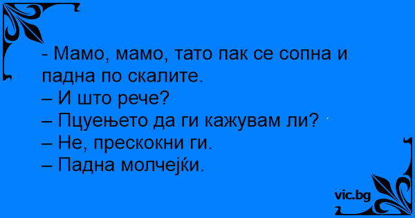 - Мамо, мамо, тато пак се сопна и падна по скалите.