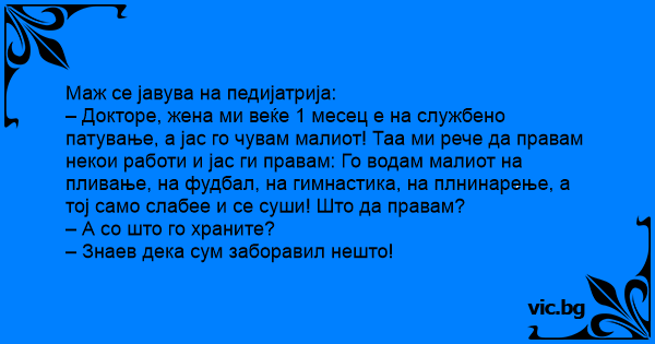– Докторе, жена ми веќе 1 месец е на службено патување, а јас го чувам малиот! Таа ми рече да правам некои работи и јас ги правам: Го водам малиот на пливање, на фудбал, на гимнастика, на плнинарење, а тој само слабее и се суши! Што да правам?
