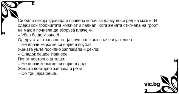 Си била некоја вдовица и правела колач за да му носи ред на маж и. И одејќи кон гробиштата колачот и паднал. Кога жената стигнала на гроот на маж и почнала да зборува плачејки: