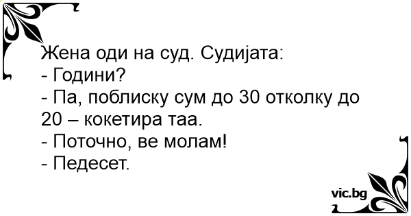Při přijímacím pohovoru: „Kolik je vám let?” „No, mám to blíže ke třicítce než ke dvacítce.” „A kolik je to doopravdy?” „Padesát.”