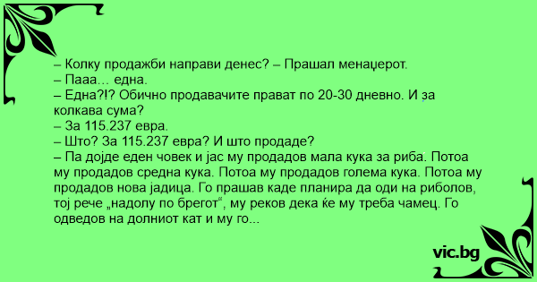 – Сакаш да ми кажеш дека човекот дошол да си купи мала кука за риба, а ти си му продал моторен чамец и автомобил?!?