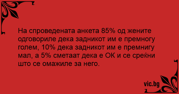 На спроведената анкета 85% од жените одговориле дека задникот им е премногу голем, 10% дека задникот им е премнигу мал, а 5% сметаат дека е ОК и се среќни што се омажиле за него.