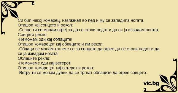 -Ветру ти се молам дувни да се тргнат облаците да огрее сонцето да го стопи ледот и да си ја извадам ногата.