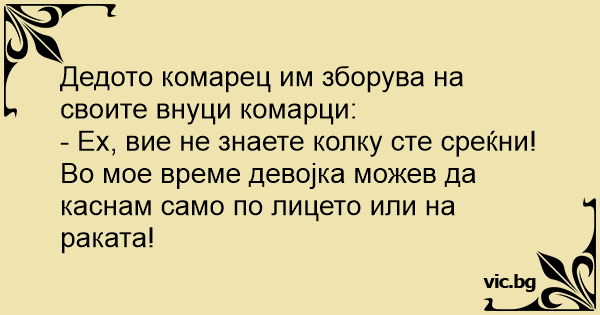 - Ех, вие не знаете колку сте среќни! Во мое време девојка можев да каснам само по лицето или на раката!