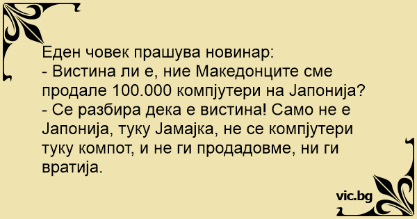 - Се разбира дека е вистина! Само не е Јапонија, туку Јамајка, не се компјутери туку компот, и не ги продадовме, ни ги вратија.