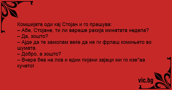 – Вчера бев на лов и едни пијани зајаци ми го изебаа кучето!