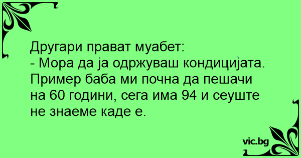 Другари прават муабет: - Мора да ја одржуваш кондицијата. Пример баба ми почна да пешачи на 60 години, сега има 94 и сеуште не знаеме каде е.