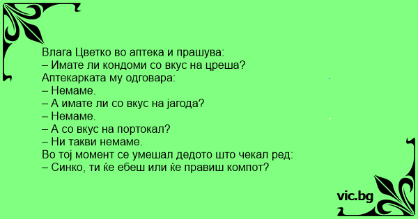 Дошло момче во аптека и бара кондом со вкус на малина. Аптекарката му вели дека немаат. - А дали имате со вкус на јагода? - Не, немаме, одговара аптекарката. Момчето малку се замислило па прашало:...