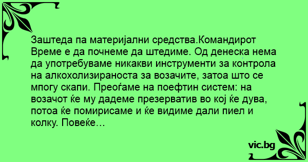 Време е да почнеме да штедиме. Од денеска нема да употребуваме никакви инструменти за контрола на алкохолизираноста за возачите, затоа што се мпогу скапи. Преоѓаме на поефтин систем: на возачот ќе му дадеме пpeзepbatиb во кој ќе дува, потоа ќе помирисаме и ќе видиме дали пиел и колку. Повеќе…