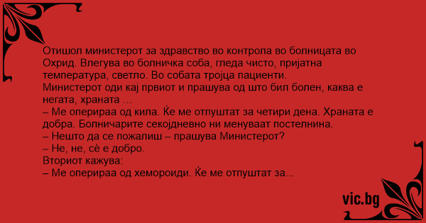 Oтишол министерот за здравство во контрола во болницата во Охрид. Влегува во болничка соба, гледа чисто, пријатна температура, светло. Во собата тројца пациенти.
