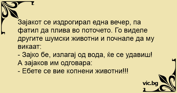 Зајакот се издрогирал една вечер, па фатил да плива во поточето. Го виделе другите шумски животни и почнале да му викаат: