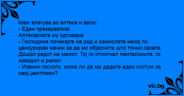 - Господине почекајте на ред и измислете некој по цензуриран начин за да ми објасните што точно сакате. Дошол редот на мажот. Тој ги откопчал панталоните, го извадил и рекол: