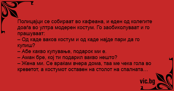 – Жена ми. Се враќам вчера дома, таа ме чека гола во креветот, а костумот оставен на столот на спалната…